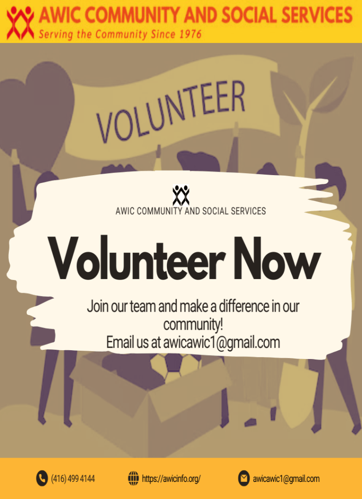 Join AWIC: Be a Volunteer, Member, Board Member or donate – Together, Building stronger communities. Please contact us by email at awicawic1@gmail.com or call us (416) 499 4144 for any inquiry.